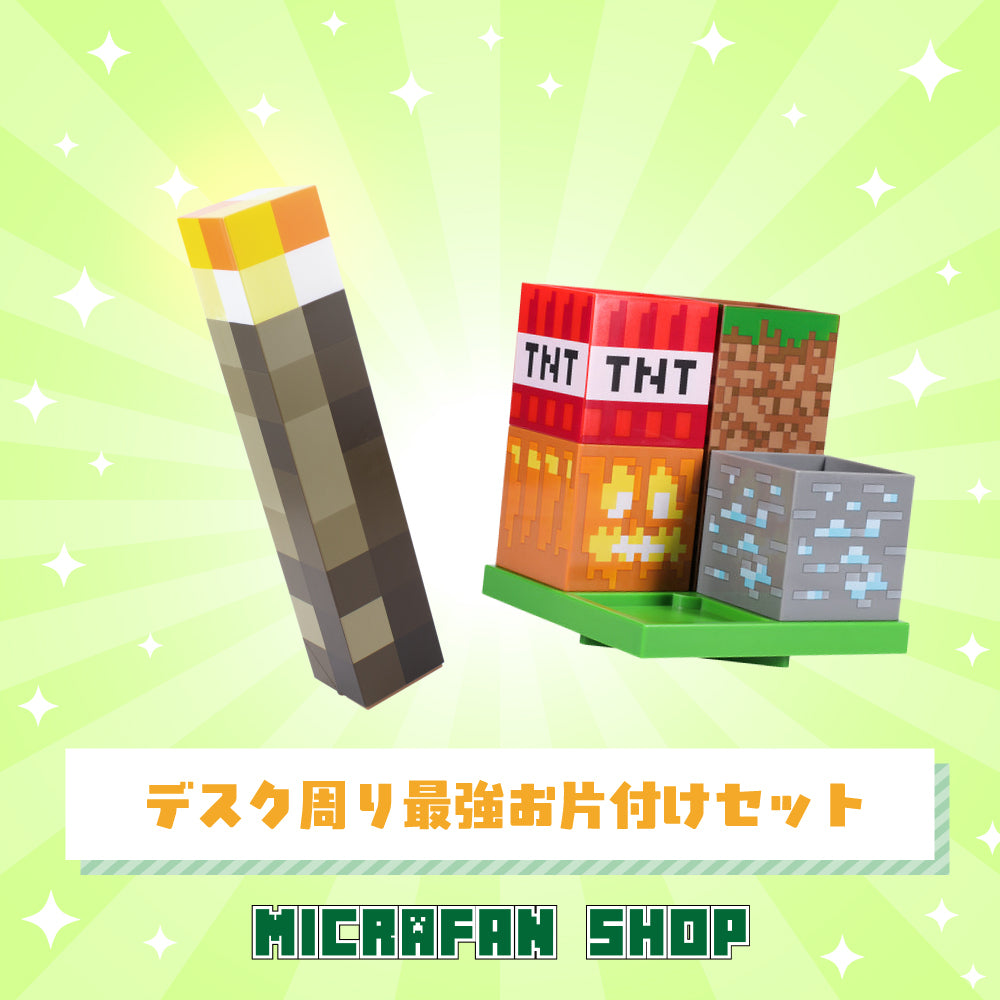 「マインクラフト デスクお片付けBOX」と、手元を明るく照らす「インテリアたいまつライト」がセットで登場。