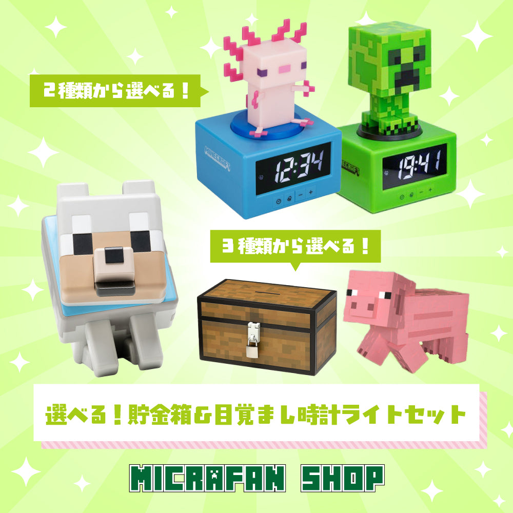 好きなキャラクターが選べる「貯金箱(オオカミ/チェスト/ブタ)」と、「目覚まし時計ライト(クリーパー/ウーパールーパー)」のカスタマイズセットです。 大事なお金は貯金箱で大切に守り、時計で一日のスケジュールを立てる。